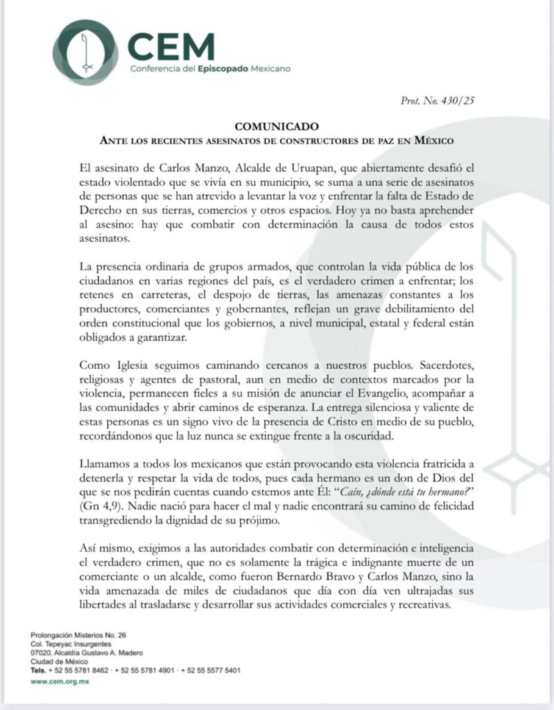 Ciudad de México.- La Conferencia del Episcopado Mexicano (CEM) expresó su profunda consternación por el asesinato del alcalde de Uruapan, Carlos Manzo Rodríguez, y llamó a enfrentar con determinación las causas que sostienen la violencia en el país.