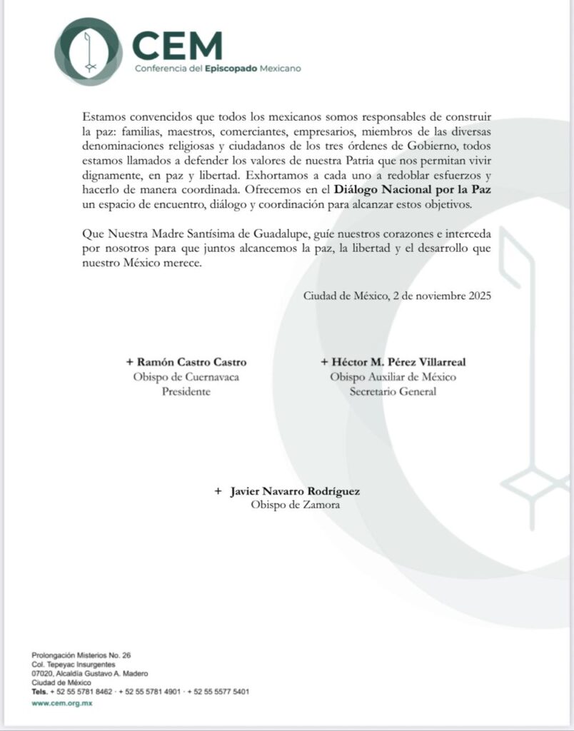 El Episcopado insistió en que la tarea de construir la paz no corresponde solo a las autoridades, sino a todos los mexicanos.