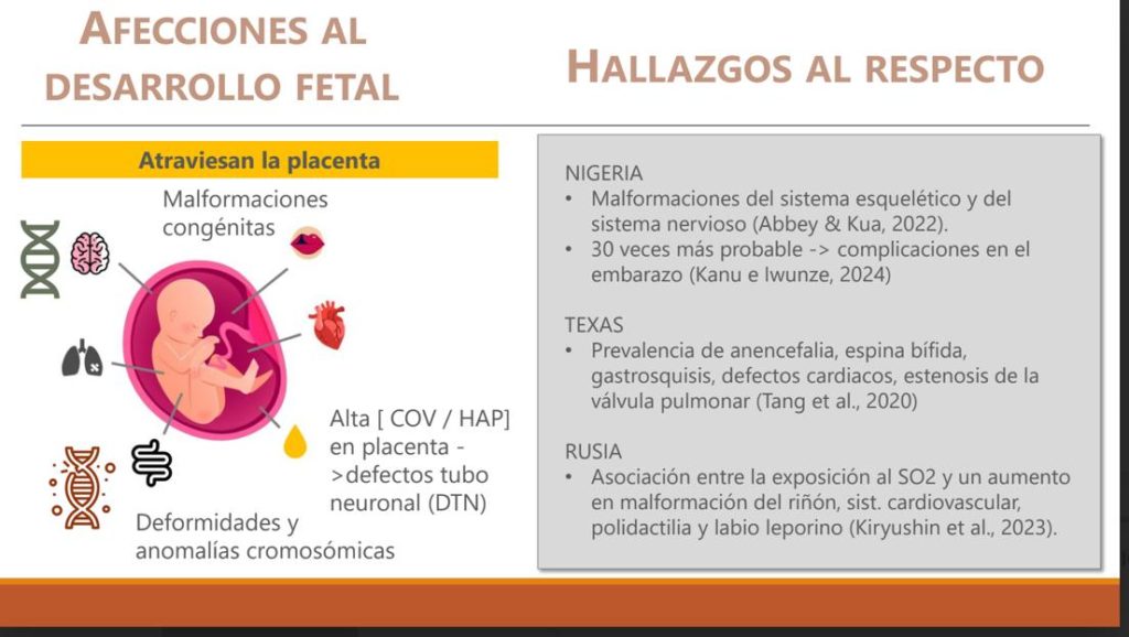 Estas emisiones están relacionadas con enfermedades respiratorias, alteraciones genéticas y cáncer, además de complicaciones perinatales.