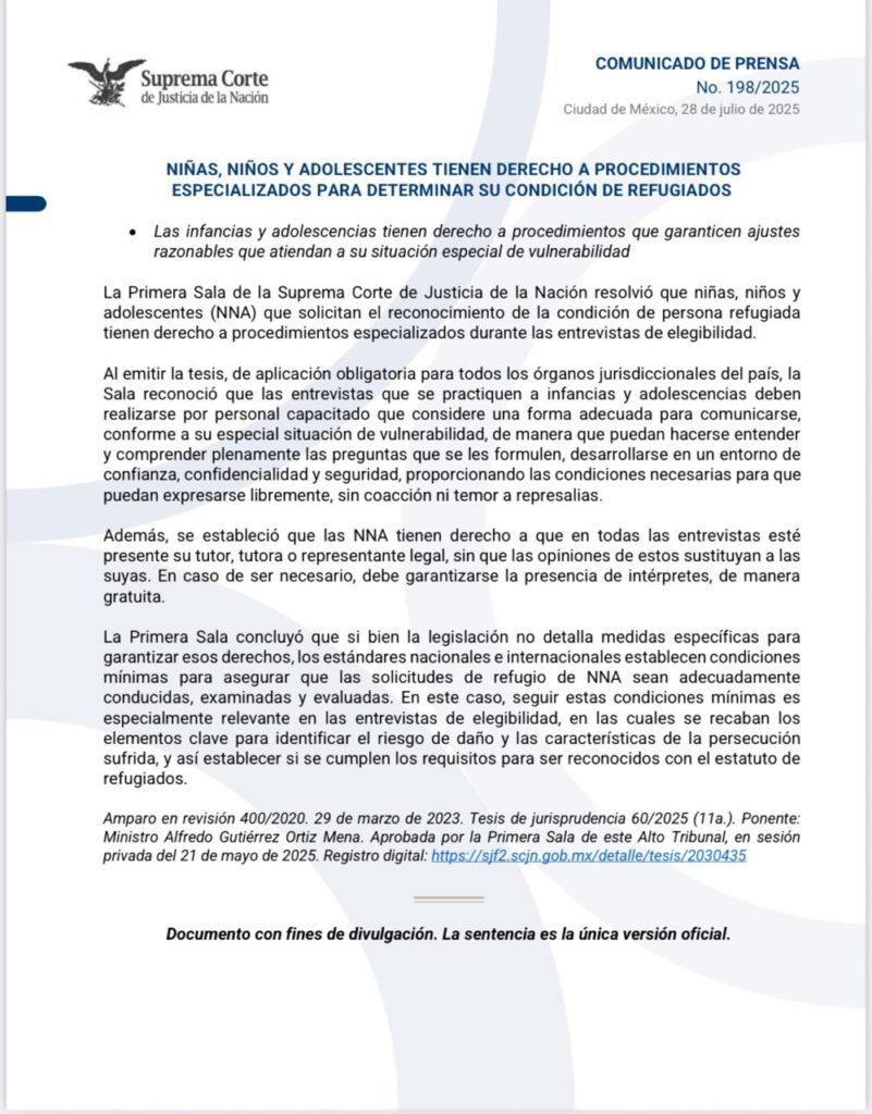 Cuidad de México.- La Suprema Corte de Justicia de la Nación (SCJN) emitió una resolución clave para la niñez migrante en México. La Primera Sala reconoció que las entrevistas de elegibilidad para el reconocimiento como persona refugiada deben realizarse con enfoque especializado.