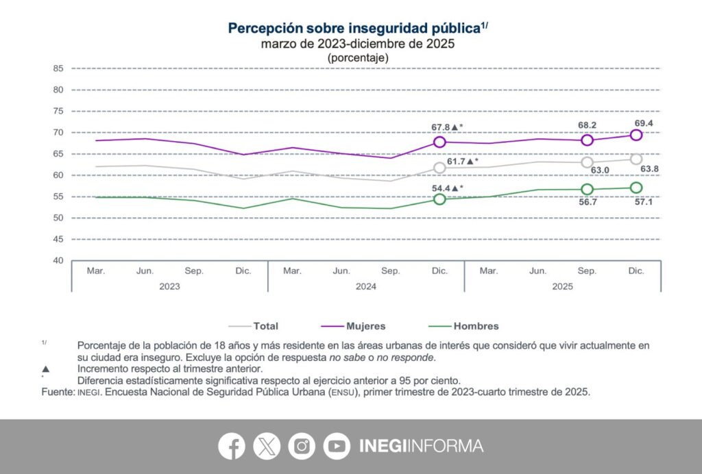 Durante el cuarto trimestre de 2025, 63.8% de las personas mayores de 18 años considera inseguro vivir en su ciudad, un aumento significativo frente a diciembre de 2024.