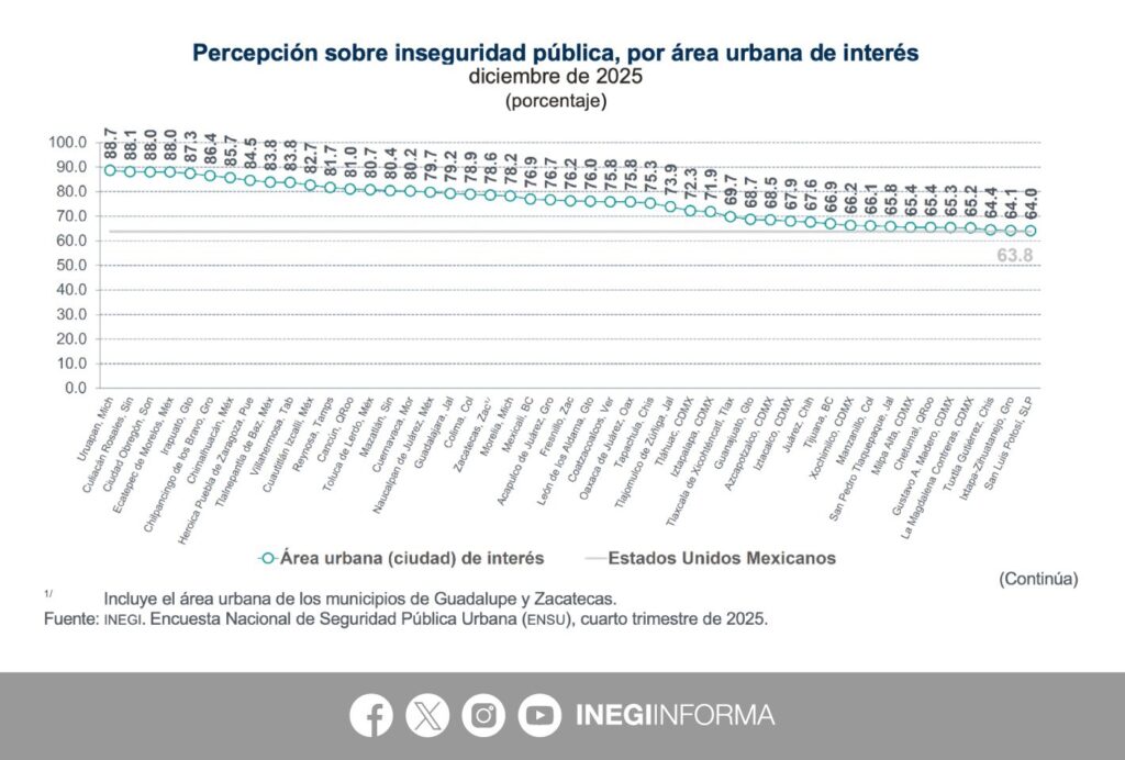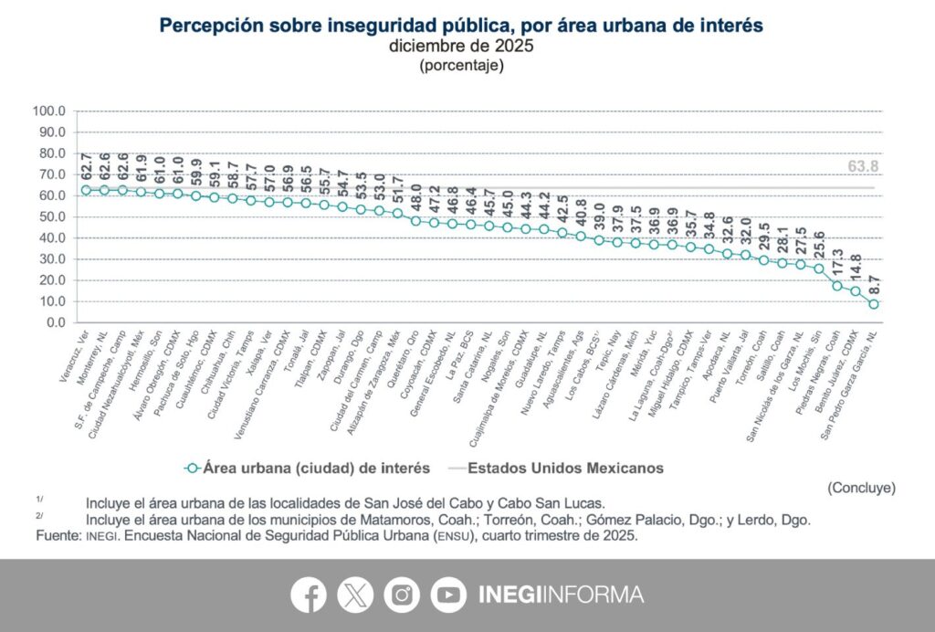 El reporte también señala que 29 áreas urbanas presentan cambios estadísticamente significativos respecto a diciembre de 2024. En 23, la percepción de inseguridad aumenta.