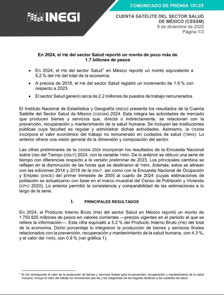 El organismo reportó también que el PIB del sector salud fue de 1.75 billones de pesos, equivalente a 5.2% del PIB nacional.