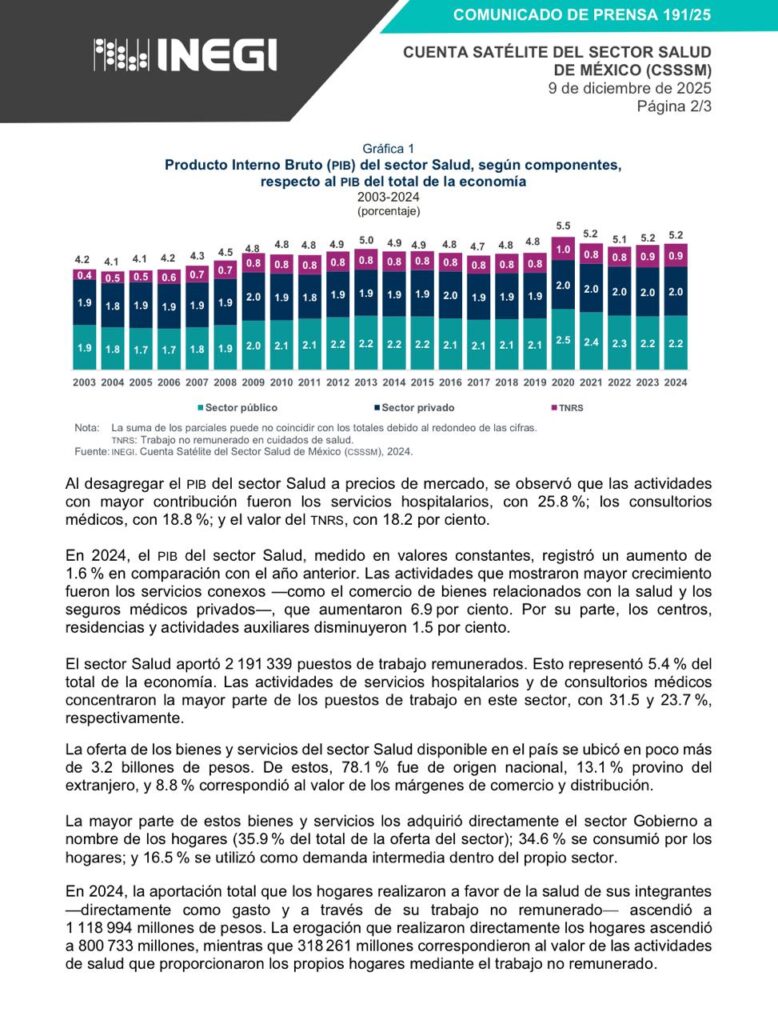 La Cuenta Satélite del Sector Salud de México 2024 (CSSSM) mostró que los hogares mantuvieron un rol central en el sistema al aportar recursos y tiempo de cuidados esenciales.