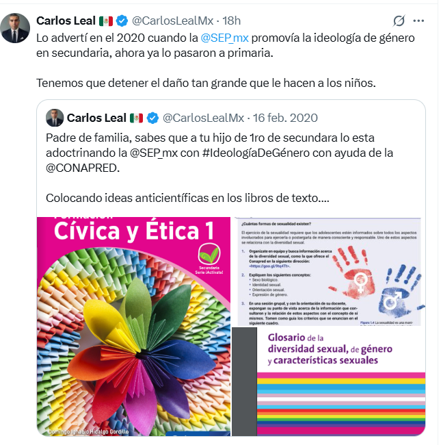 El exdiputado Carlos Leal recordó que en 2020 la SEP impulsó contenidos sobre ideología de género en secundaria y ahora los amplía a nivel primaria.