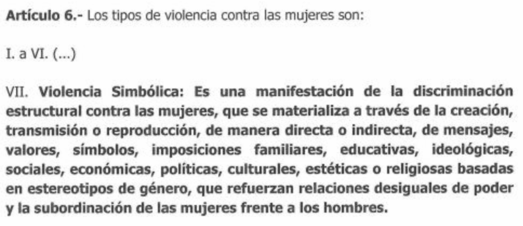 “Una manifestación de la discriminación estructural contra las mujeres, que se materializa a través de la creación, transmisión o reproducción, de manera directa o indirecta, de mensajes, valores, símbolos, imposiciones familiares, educativas, ideológicas, sociales, económicas, políticas, culturales, estéticas o religiosas basadas en estereotipos de género…”