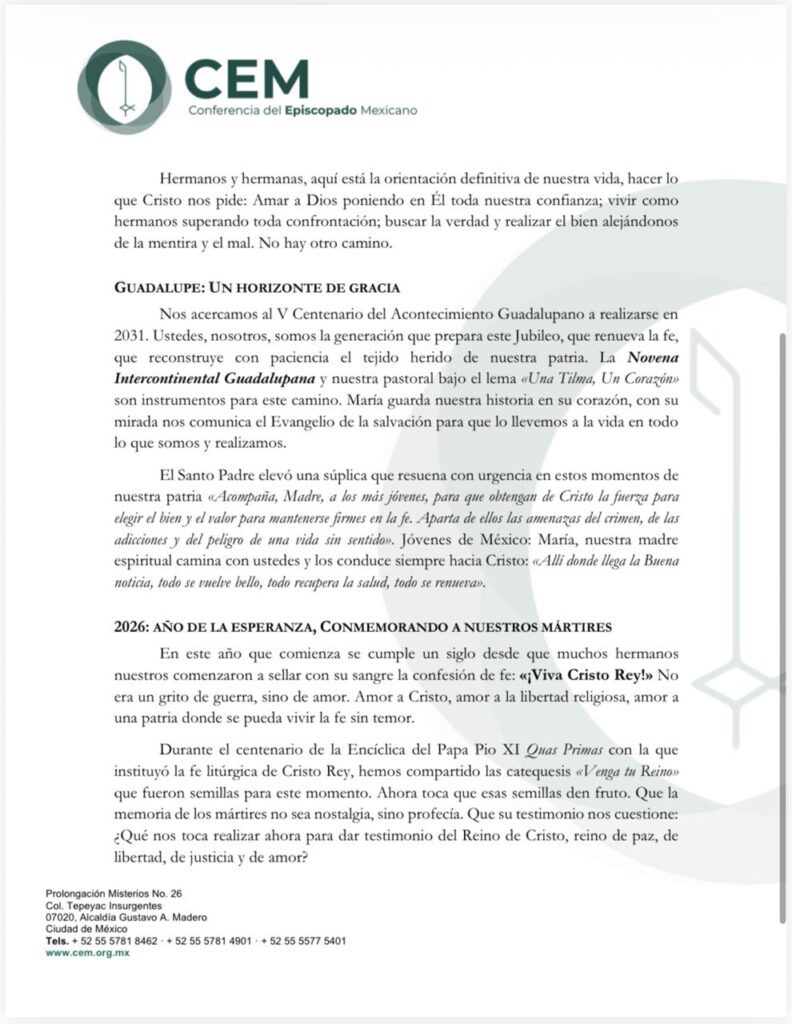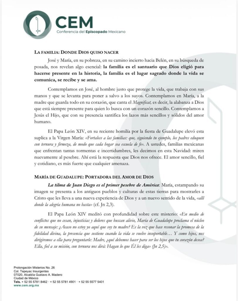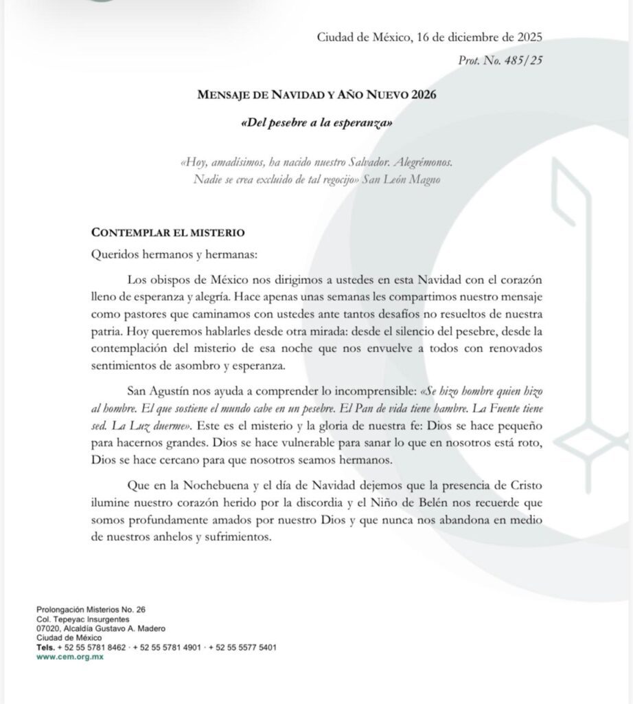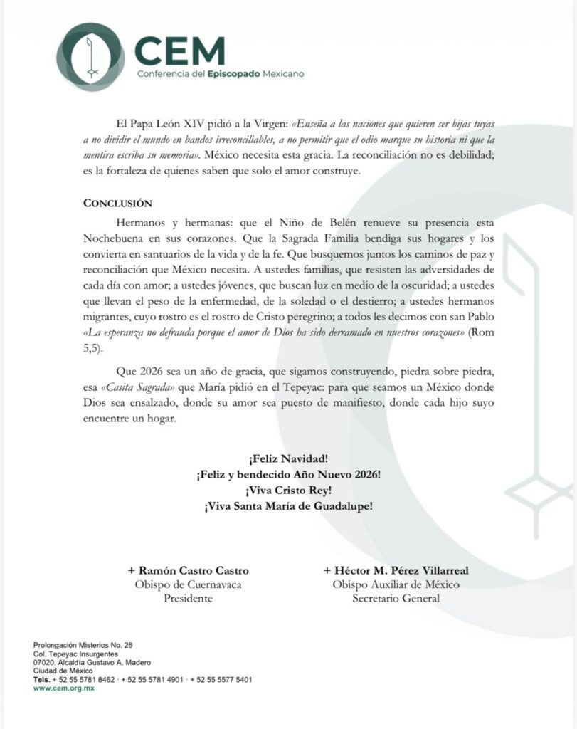 La CEM concluyó deseando una Feliz Navidad y un bendecido Año Nuevo 2026, e invitó a las familias mexicanas a caminar juntas en la construcción de un país donde prevalezcan la fe, el amor y la esperanza.