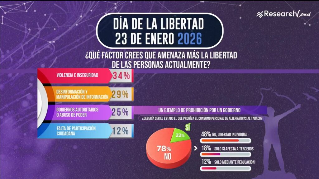 La encuesta también abordó el debate sobre la intervención del Estado en decisiones personales, como la posible prohibición del consumo de alternativas al tabaco. En este punto, 78% de las personas considera que está mal que el gobierno prohíba, aunque reconoce la necesidad de ciertas regulaciones o restricciones cuando existe afectación a terceros, lo que refleja una postura equilibrada entre libertad individual y responsabilidad social.