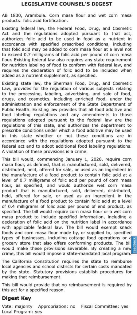 La ley AB1830 entró en vigor tras la firma del gobernador Gavin Newsom. La norma exige que la harina de maíz contenga ácido fólico. Este ingrediente resulta clave en tortillas, tamales y otros alimentos básicos.