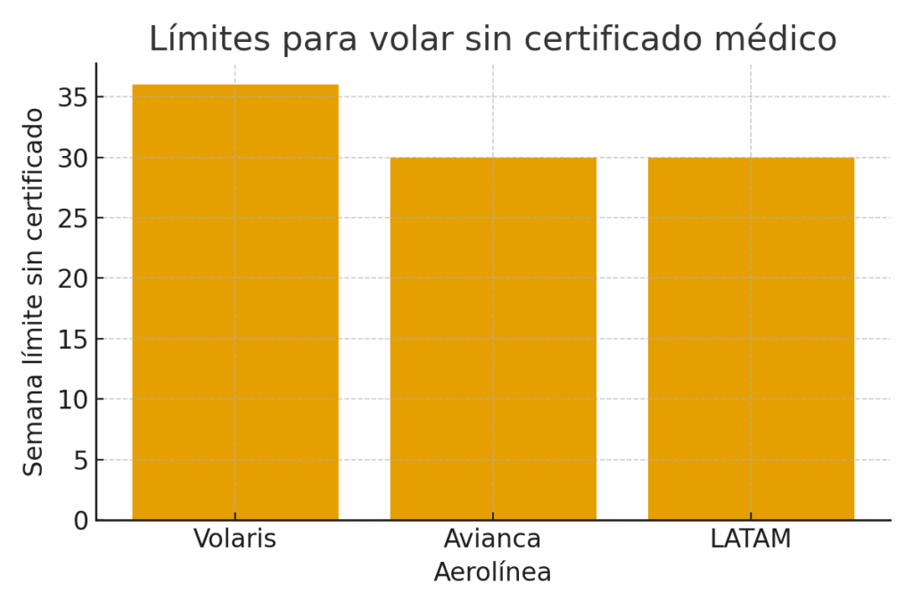 Avianca permite viajar sin certificado hasta la semana 30. Después de ese punto, exige una constancia médica reciente que confirme que el vuelo es seguro. La compañía no permite abordar después de la semana 36. Las pasajeras deben firmar un formulario de responsabilidad en rutas específicas.