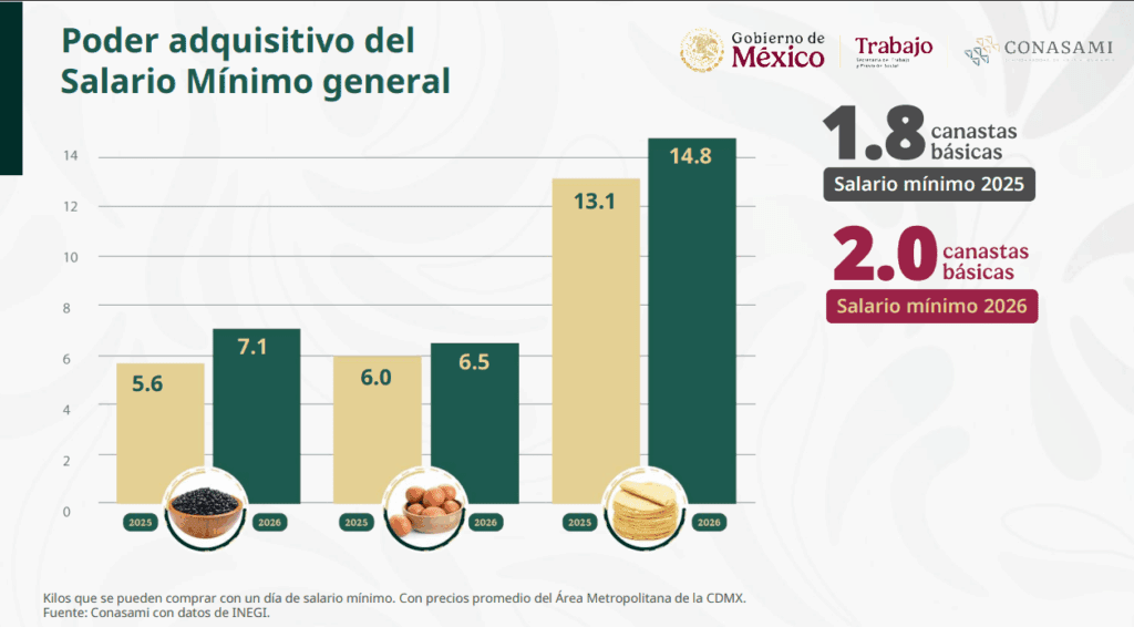 El secretario del Trabajo y Previsión Social, Marath Baruch Bolaños López, informó que el poder adquisitivo del salario mínimo registra un crecimiento acumulado en ocho años y que en la frontera permanece arriba del máximo histórico. Bajo ese parámetro, dijo, la capacidad para adquirir la canasta básica se estima en dos unidades en 2026 y en 2.8 en la franja fronteriza.