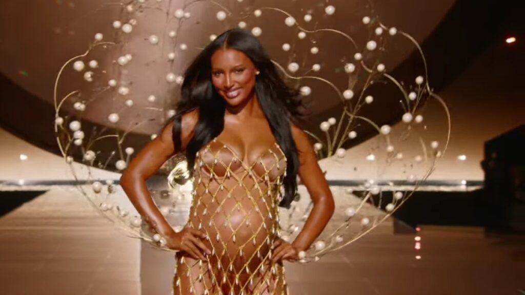 La protagonista fue Jasmine Tookes, uno de los rostros más reconocidos de la firma, quien lució con orgullo su segundo embarazo mientras abría el espectáculo en el Brooklyn Navy Yard de Nueva York. Con un vestido de red transparente y alas inspiradas en una concha marina —símbolo de feminidad y fortaleza—, Tookes recibió una ovación de pie al representar, literalmente, una nueva era para la marca y para la moda.