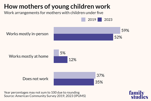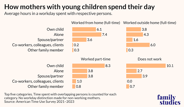 Un análisis del Institute for Family Studies, indica que las madres que trabajan desde casa dedican más horas al cuidado diario de sus niños que aquellas que lo hacen de manera presencial.
