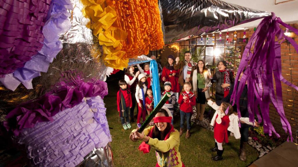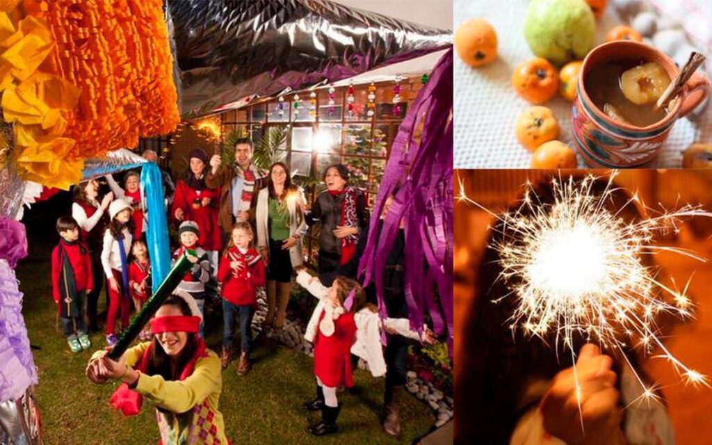 Dentro, se ofrece ponche caliente, buñuelos, frutas y dulces; los niños rompen piñatas, evocando la victoria sobre el pecado.