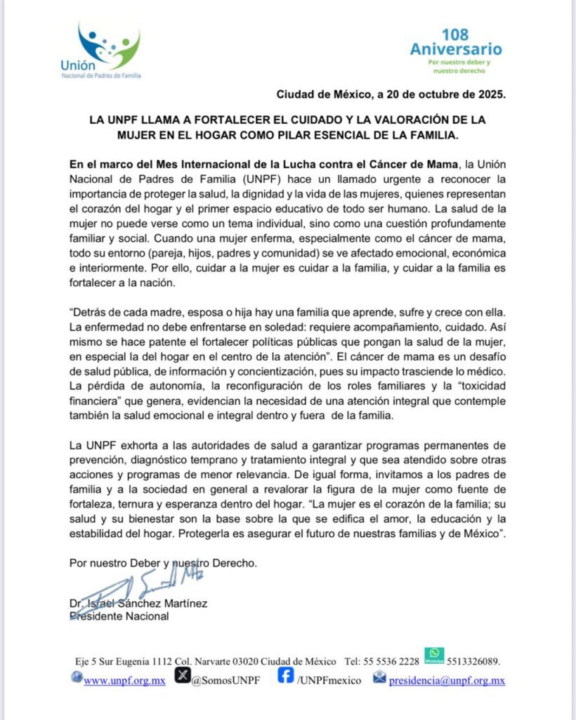 Ciudad de México.- En el marco del Mes Internacional de la Lucha contra el Cáncer de Mama, la Unión Nacional de Padres de Familia (UNPF) hizo un llamado urgente a reconocer que proteger la salud de las mujeres significa cuidar a la familia y fortalecer al país.